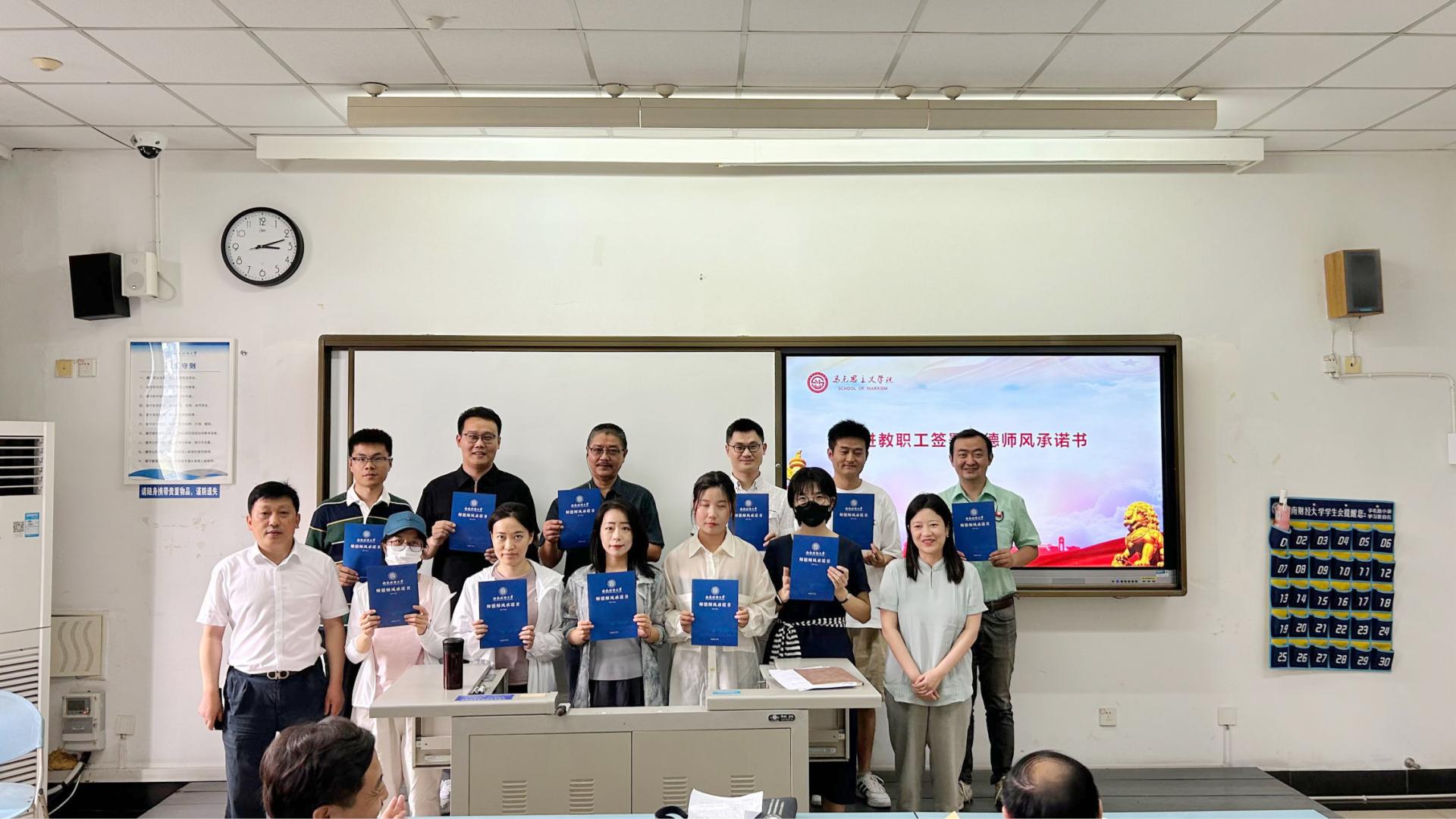 周立成认真听取汇报,强调了开展职业发展规划的重要意义,高度肯定了学院青年教职工的职业发展规划,并就规划提出了有建设性的意见和建议。随后,新任教职工签订《师德师风承诺书》。