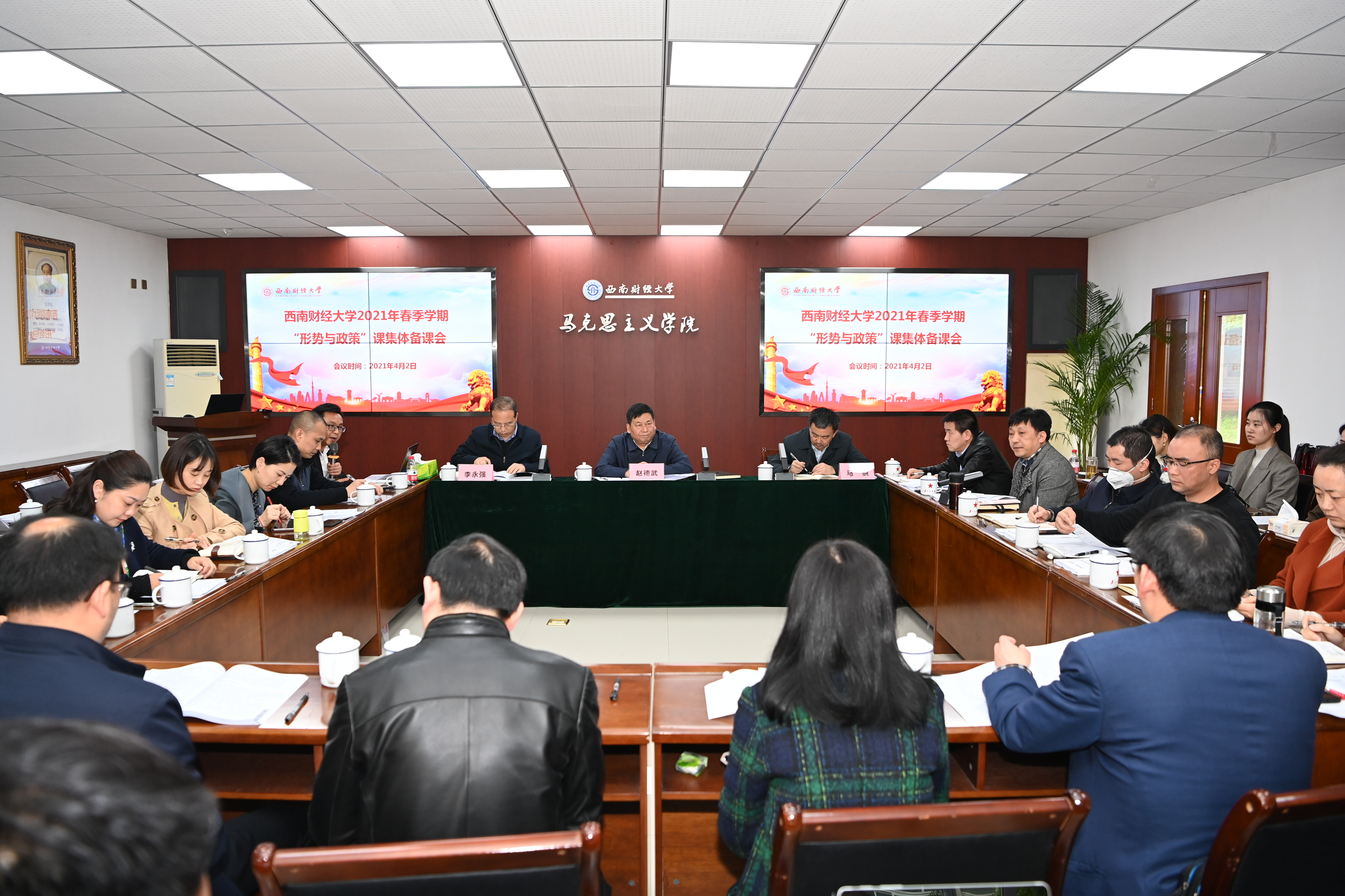 为扎实推进党的最新理论创新成果和党史教育进课堂,不断加强马克思主义形势观政策观教育,4月2日下午,学校在通博楼A117会议室召开新学期“形势与政策”课集体备课会。公司党委书记赵德武、党委副书记马骁、副董事长李永强出席指导,党委办公室、组织人事部、宣传部、员工工作部、教务处、研究生院、教师教学发展中心等职能部门负责人,英国365上市公司全体领导班子成员,“形势与政策”课备课专家和任课教师代表参加备课会。公司党总支书记雷栋良主持会议。