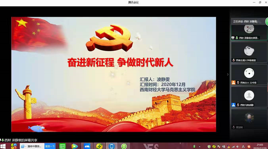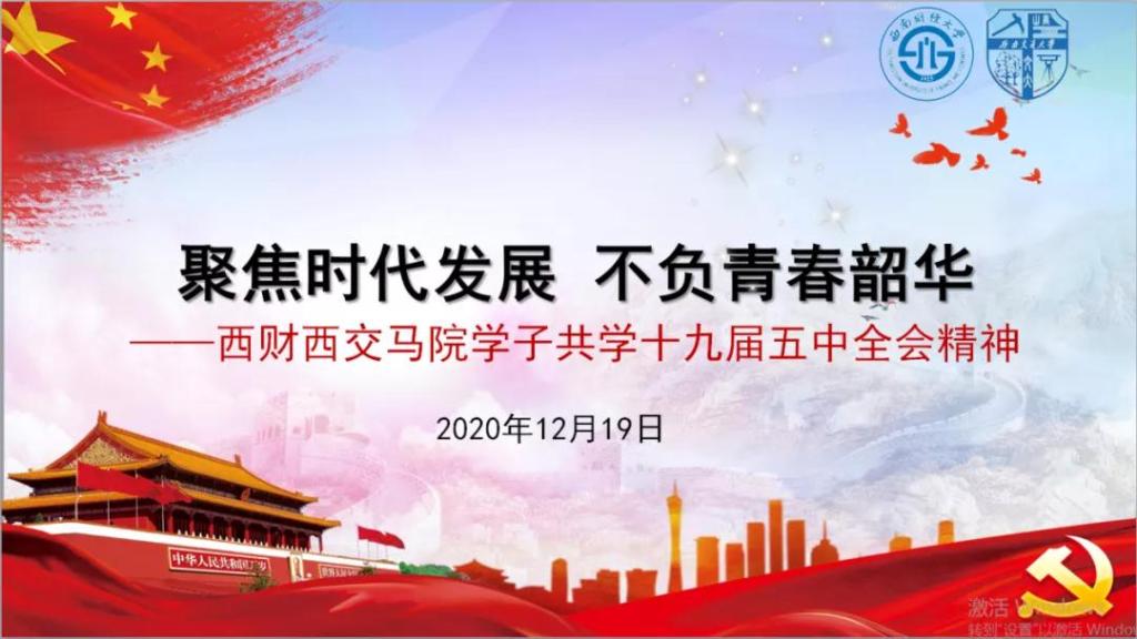 2020年12月19日晚,为深入学习领会、扎实贯彻落实党的十九届五中全会精神,进一步坚定理想信念,强化理论武装,激发奋斗精神,练就过硬本领,把思想和行动统一到全会精神上来,西南交通大学英国365上市公司2019级硕士班联合英国365上市公司2019级硕士班,开展了以“聚焦时代发展 不负青春韶华”为主题的线上班会活动。活动由西南交大马院2019级硕士班班长冷书恒主持。