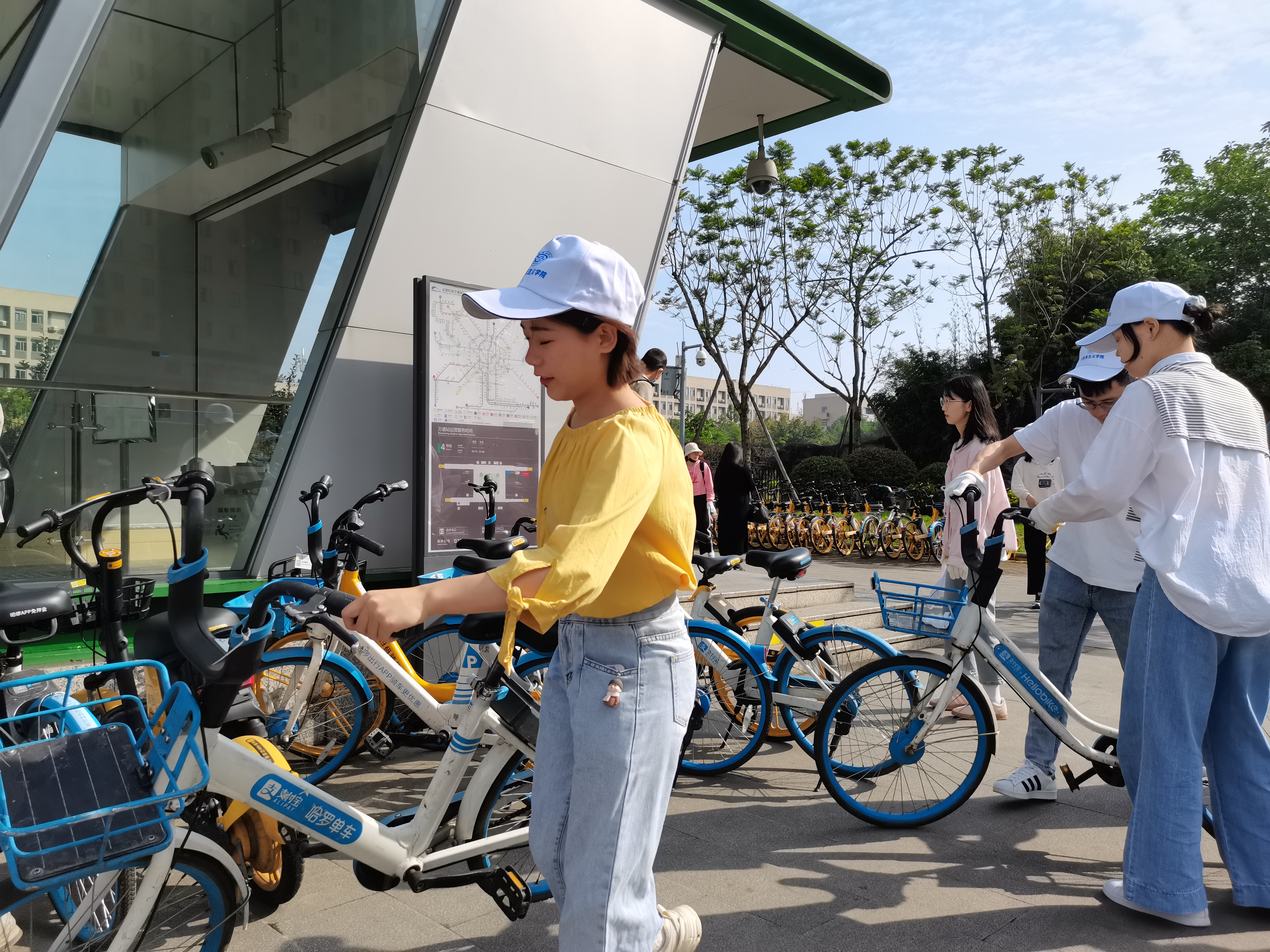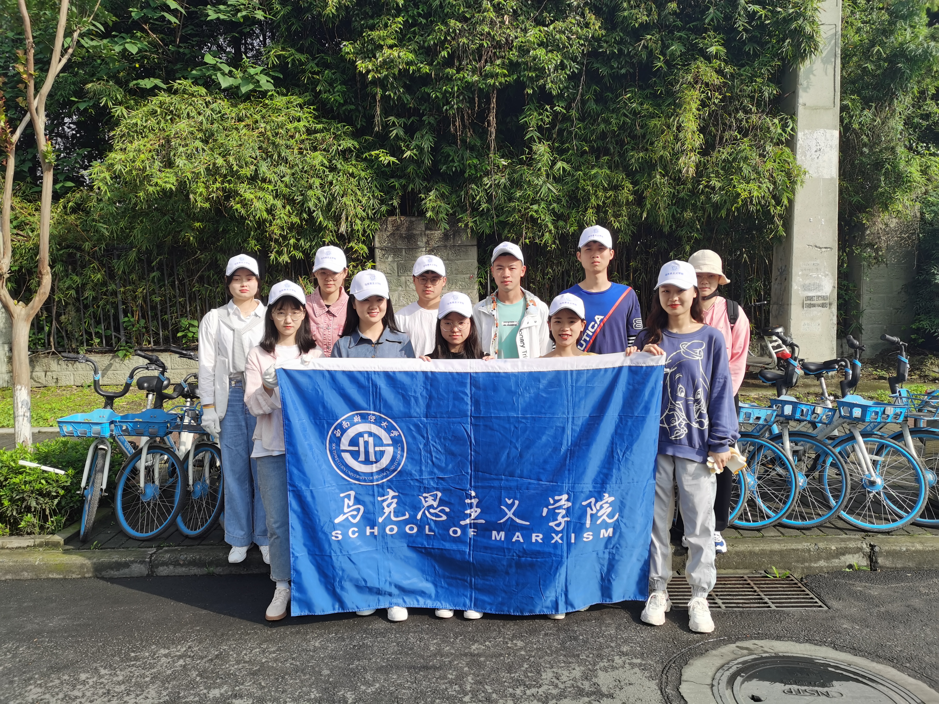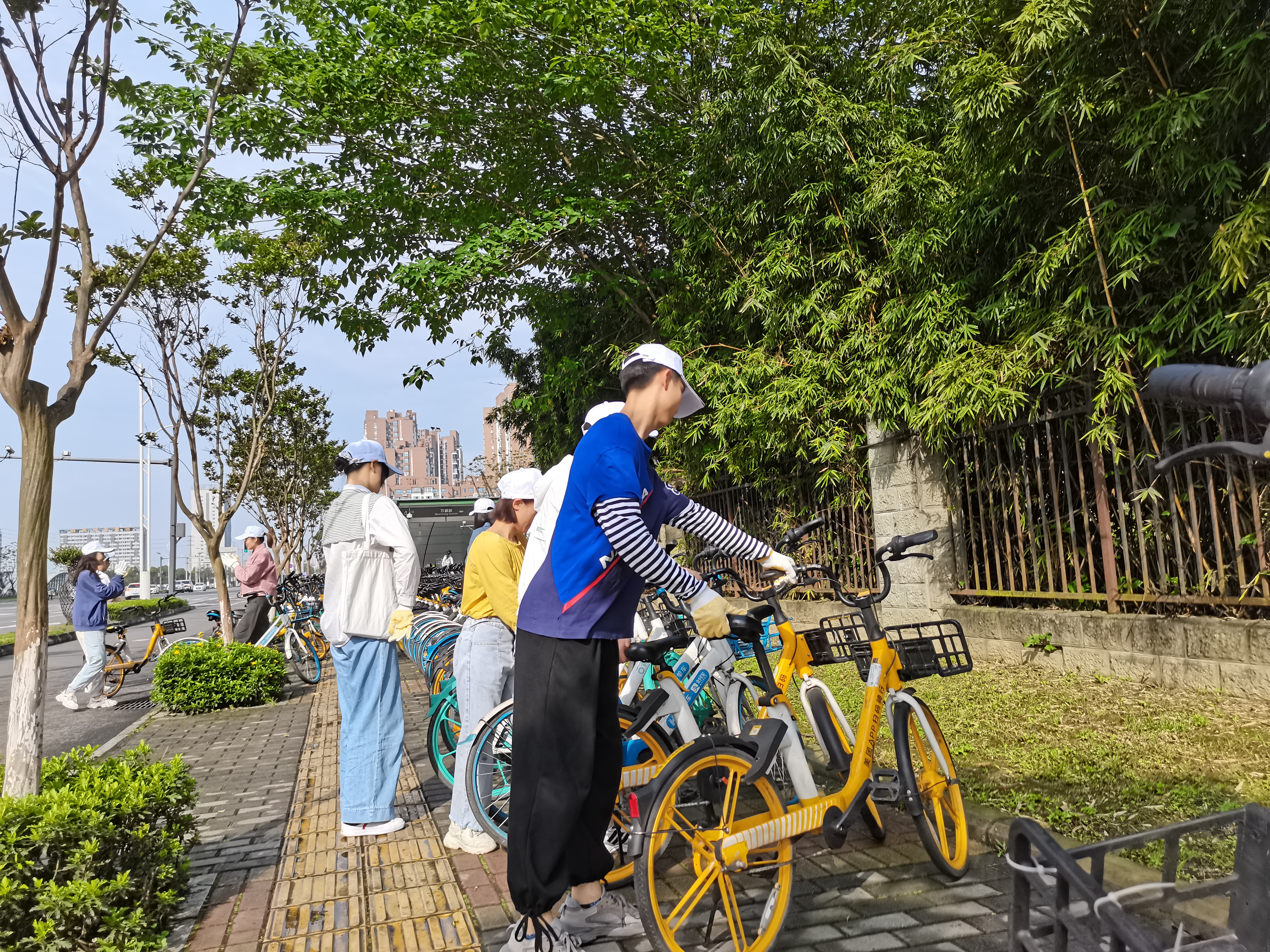 上午9时,同学们在学校南门整队集合,进行简单工作分配后,便开始了此次志愿服务活动。同学们从学校南门开始,一路经行万盛地铁站、学校西门、北门和东门,将一些乱停乱放和倒在地上的共享单车扶回指定停车地点并按统一方向摆放整齐。同时,把因各种原因损坏的共享单车信息以相应APP上报。