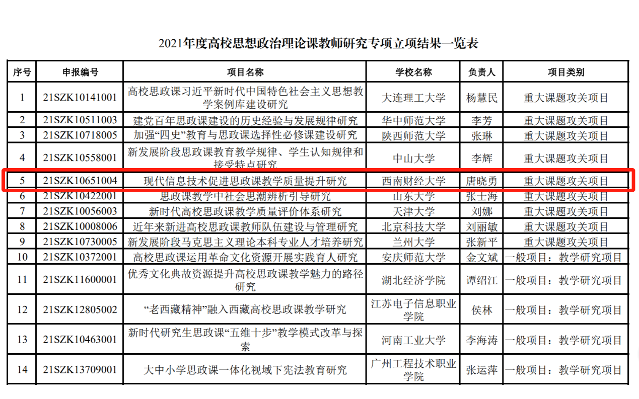 近日,教育部社科司公布了2021年度高校思想政治理论课教师研究专项立项名单,公司经理唐晓勇教授作为首席专家申报的重大课题攻关项目《现代信息技术促进高校思想政治理论课教学质量提升研究》获准立项。