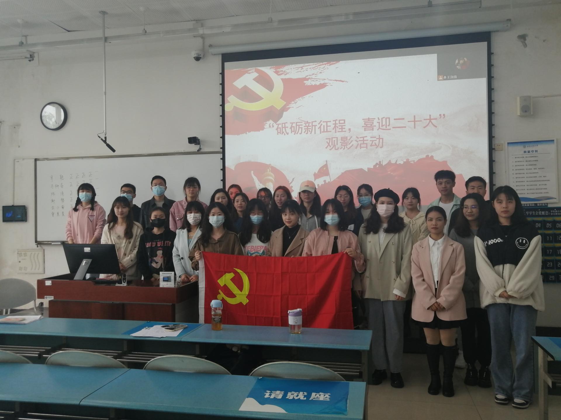 为迎接党的二十大召开,深入落实习近平总书记关于党史国史的重要思想,聚焦抓好党的事业后继有人这个根本大计,团结引领广大党员群众坚定跟党走,建功新时代。2022年3月25日上午10点,公司党总支研究生第四党支部在颐德楼H411开展了“砥砺新征程,喜迎二十大”爱国主题特色观影活动。公司党总支研究生第四党支部全体党员参加了观影活动。