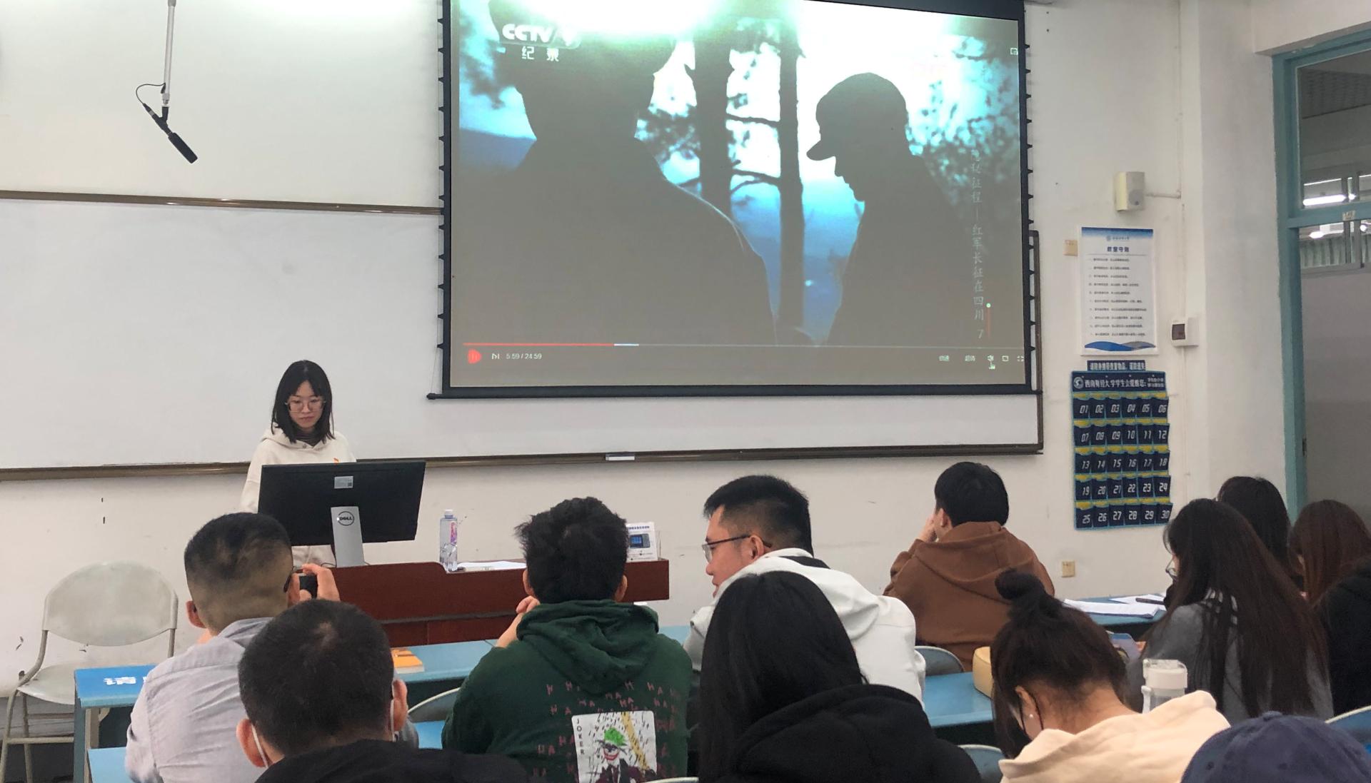 首先,祁琦同志介绍了1932年到1935年,为了组织群众和震慑敌人,红四方面军在川陕苏区通江境内书写錾刻了大量的石刻标语。随后,通过讲述通江錾字队把党的革命纲领、红军的宗旨和纪律等錾刻到石头上,如“赤化全川”、“平分土地”等口号,让我们感受到不管是红军还是人民大众,其都在用自己的方式争取着革命的胜利。最后,祁琦同志播放了纪录片《隐蔽征程——红军长征在四川》中通江錾字队的故事,展现了红军革命火种在四川播撒的力量。