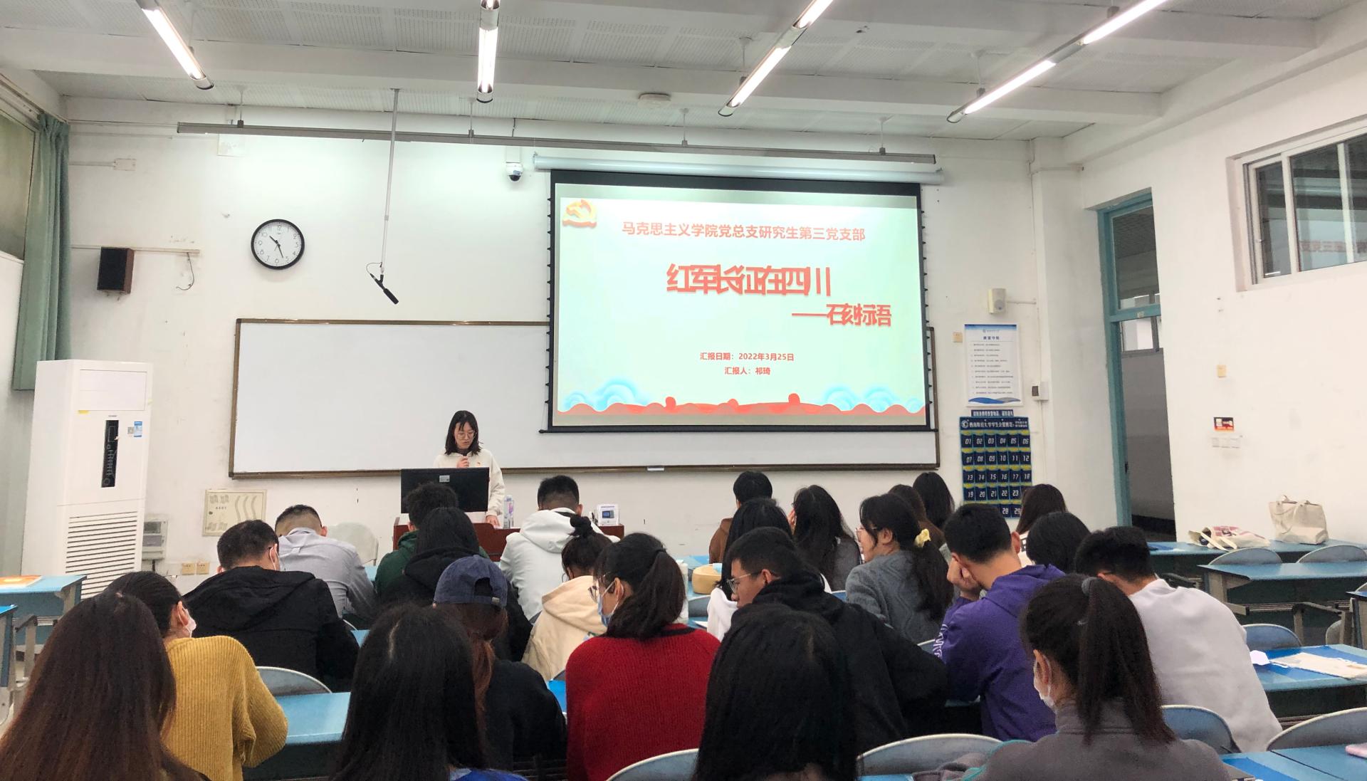 学习历史使人明心,学习精神催人奋进。为了拓展党史学习教育路径、创新党史学习方式,充分调动高校老员工对党史学习的主动性、积极性,2022年3月25日,公司党总支研究生第三党支部在颐德楼H206开展“红军长征在四川”第三次党史学习教育特色活动。本次党史学习教育由公司党总支研究生第三党支部书记袁可心主持,由支部党员祁琦主讲,支部全体党员参加。