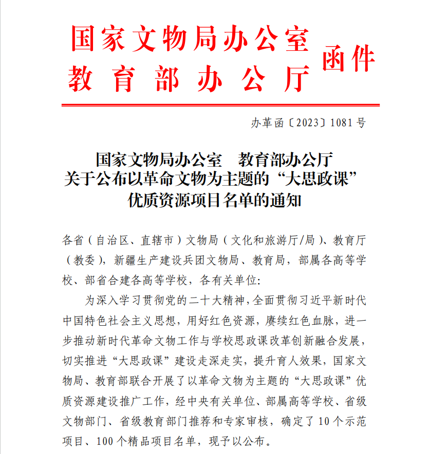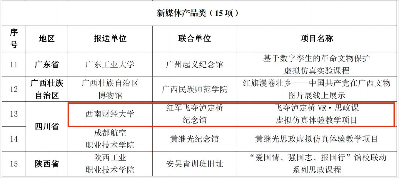11月27日,国家文物局办公室、教育部办公厅公布了以革命文物为主题的“大思政课”优质资源项目名单,确定了10个示范项目、100个精品项目。公司联合红军飞夺泸定桥纪念馆报送的“飞夺泸定桥VR·思政课虚拟仿真体验教学项目”成功入选精品项目名单。