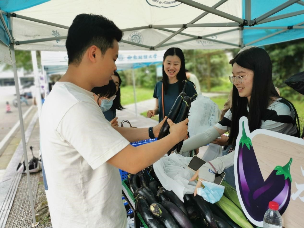 此次劳动实践活动分为两个环节。第一个环节是蔬菜采摘,同学们热情参与,采摘搬运、分拣称重都井然有序地进行着。第二个环节是蔬菜售卖,在员工活动中心的“SWUFE劳动集市”上,同学们自行布置蔬菜售卖的点位,自主定价进行蔬菜售卖。