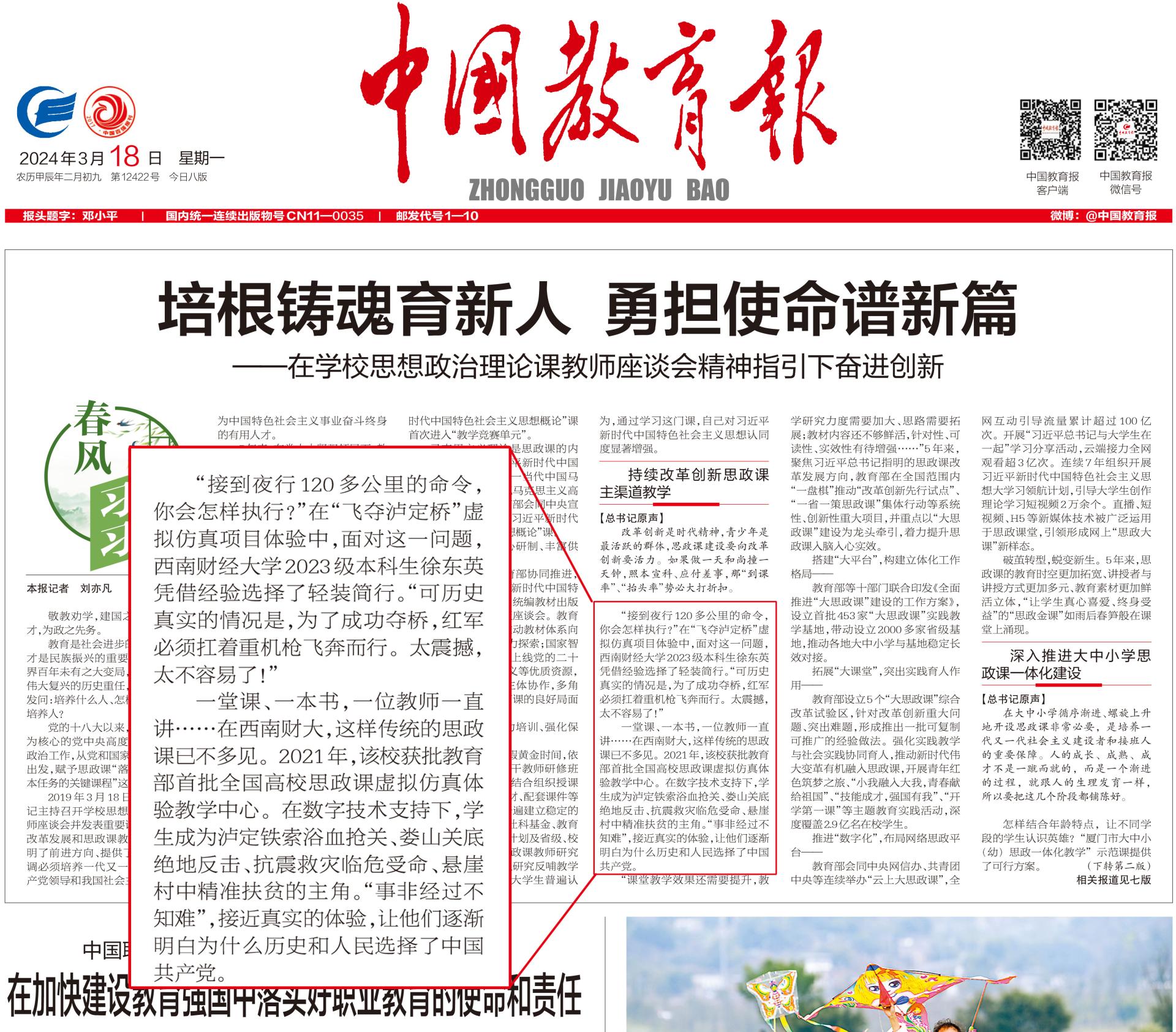 原文链接:《中国教育报》电子版 - 中国教育新闻网 - 《培根铸魂育新人 勇担使命谱新篇——在学校思想政治理论课教师座谈会精神指引下奋进创新》