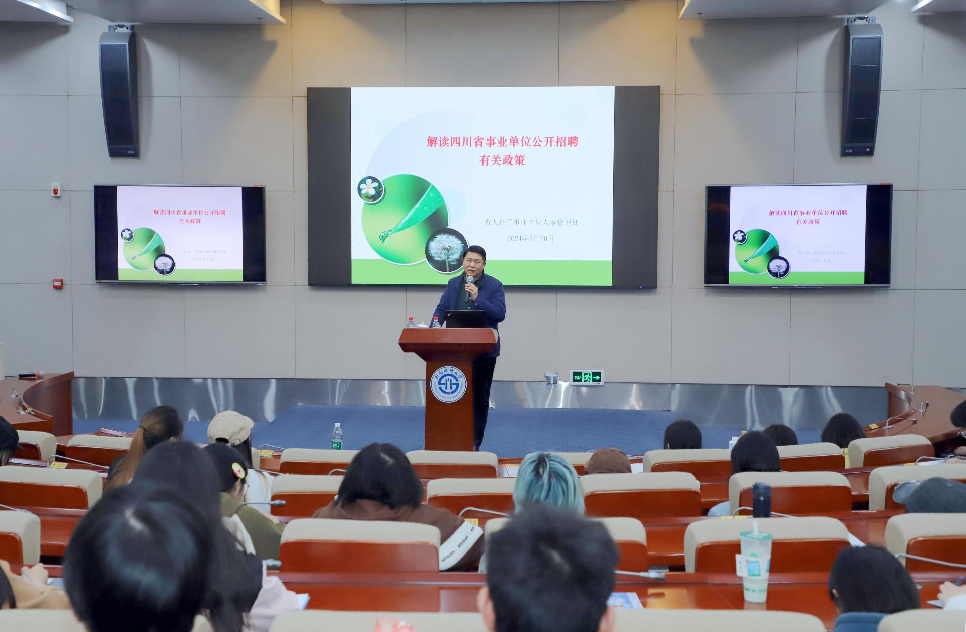 为回应学院研究生事业单位招考指导需求,增强行业岗位认知和就业能力,3月20日晚,马克思主义院联合外国语学院、财政税务学院、计算机与人工智能学院、数学学院在弘远楼101举办《事业单位招聘政策及面试解读》专题讲座。本次讲座邀请到四川省人力资源和社会保障厅事业单位人事管理处副处长戴元章主讲,学院研究生同学及员工工作负责人参加了讲座。