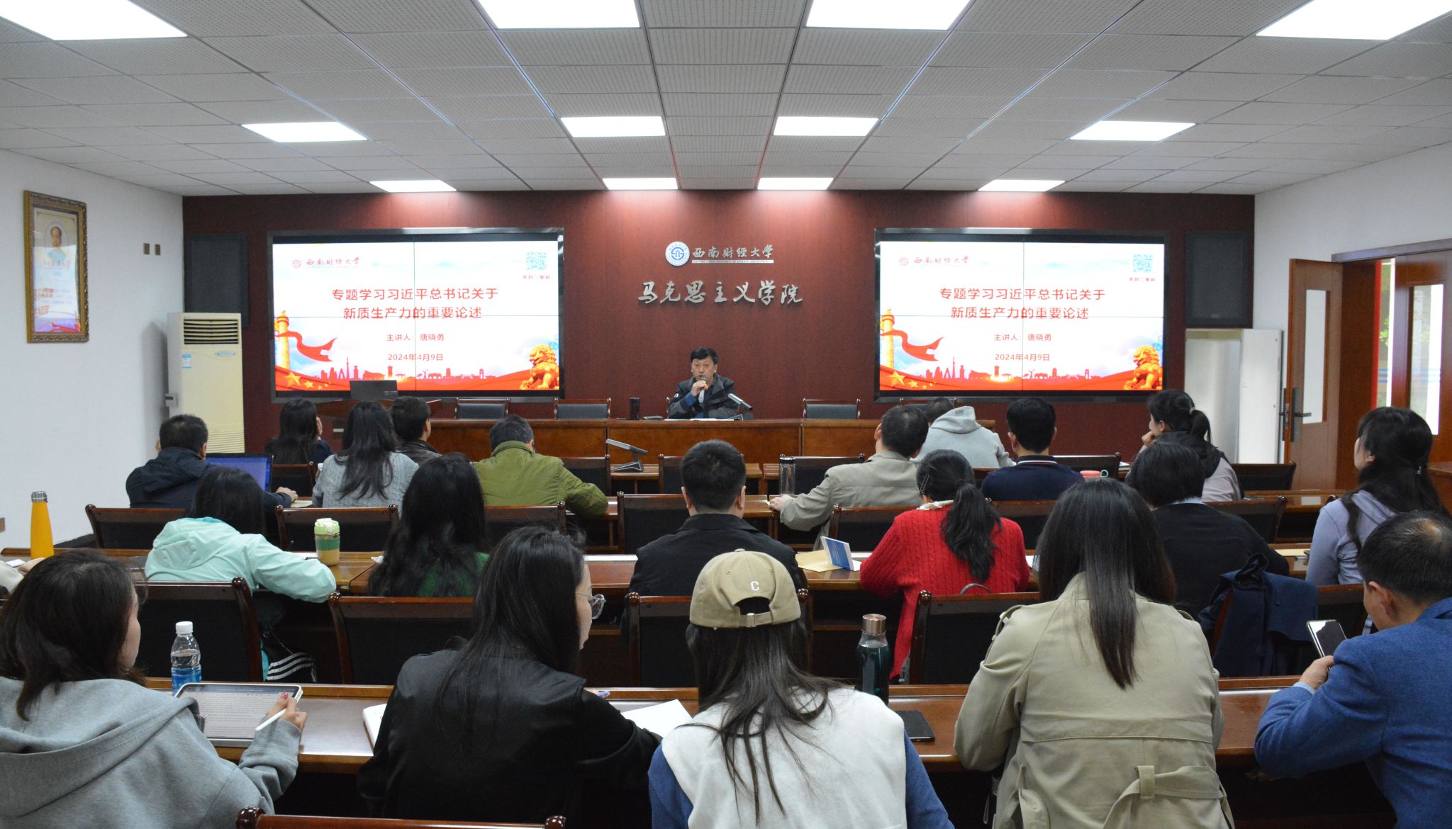 唐晓勇围绕主题,从什么是新质生产力、生产力标准的正确应用及全面理解、如何把握新质生产力与新型生产关系的关系三个方面,给学院教职工上了一堂主题鲜明、内涵深刻、针对性强的党课。他强调,习近平总书记有关“新质生产力”的重要论述是对马克思主义生产力理论的创新发展和重要拓展,是习近平经济思想的原创性贡献,理论和实践意义重大。唐晓勇指出,全体教师党员要深刻领会习近平总书记关于新质生产力理论的科学内涵,加强阐释研究,聚焦立德树人,落实好新质生产力理论进教材、进课堂、进头脑,大力推动思政课改革创新,为新时代思政课提质增效注入西财马院力量。