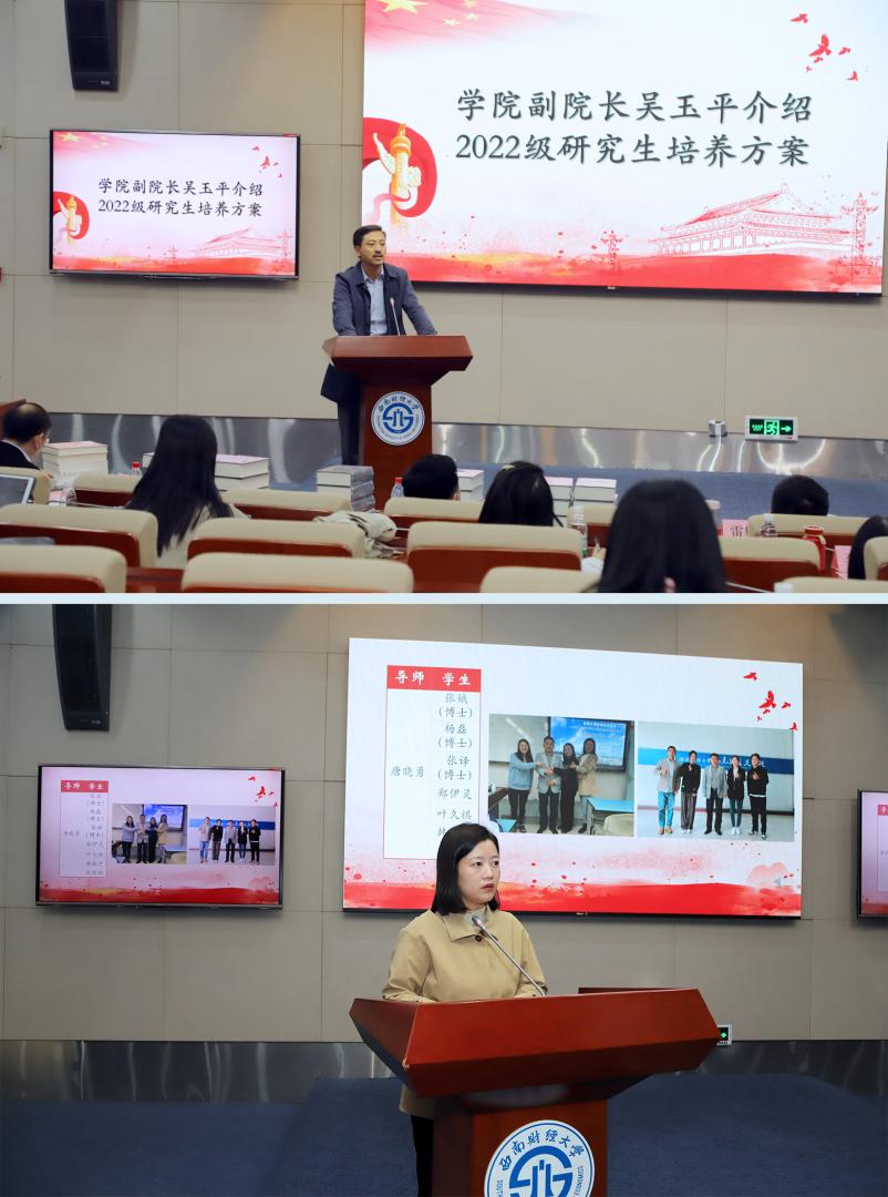 公司副经理吴玉平向员工们介绍了2022级公司产品方案,鼓励大家科学合理规划学业,积极参加学术活动,严格遵守学术规范,争做西财优秀学子。公司党委副书记钟芸莹宣读了2022级导师和员工名单,并祝愿同学们在导师的指导下学有所成,不负好时光。