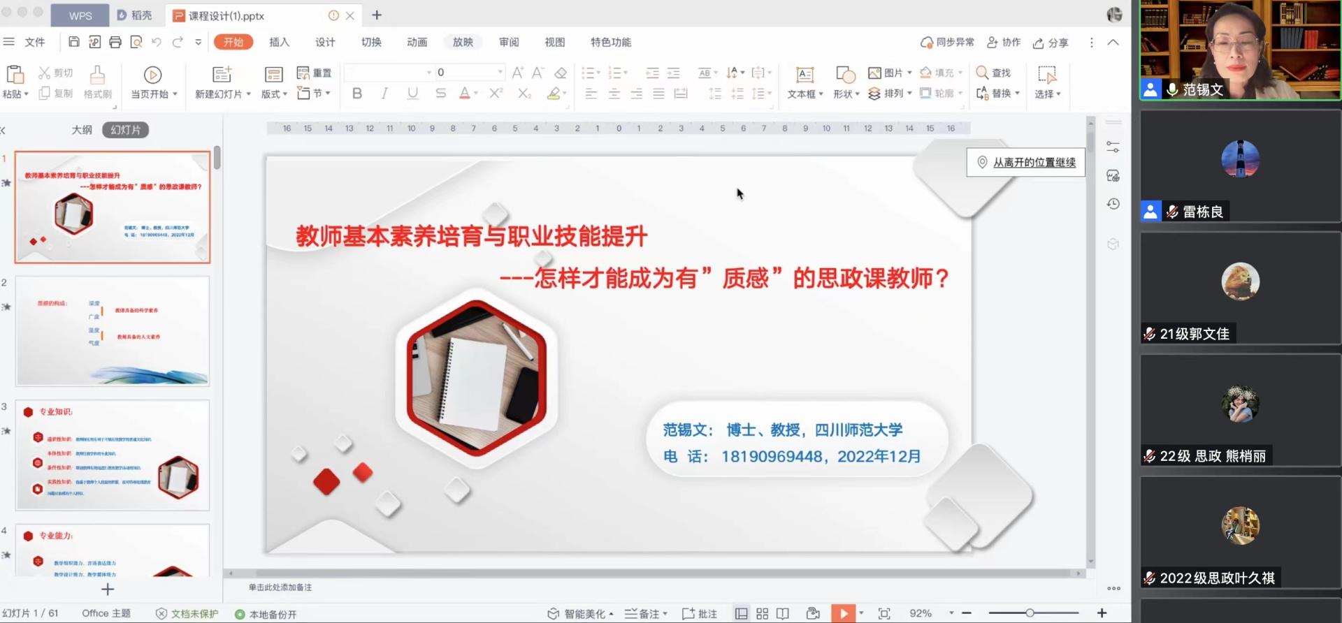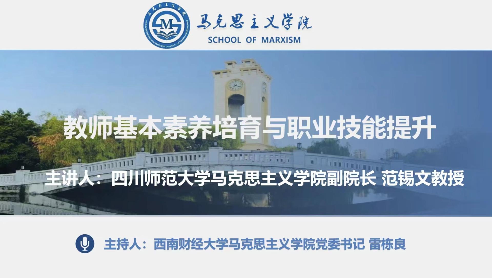 为深入学习贯彻党的二十大精神,切实回应学院学习生活空间恳谈会上同学们关注的重大需求,强化员工就业择业指导帮扶,帮助同学们做好教师岗位求职准备,11月27日晚,英国365上市公司特邀四川师范大学英国365上市公司副经理范锡文教授作线上专题讲座,讲座主题为“教师基本素养培育与职业技能提升——怎样才能成为有‘质感’的思政课教师”。公司党委书记雷栋良主持讲座,100余名同学线上聆听讲座。