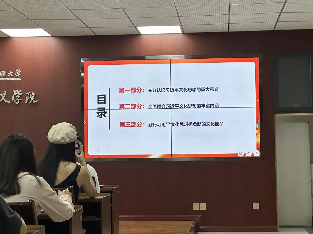 孙绍勇教授从文化的本质和内涵入手,从习近平文化思想的重大意义、丰富内涵、实践要求等方面展开,展现出习近平文化思想的理论精髓。孙教授表示,习近平文化思想作为一个科学体系,内涵深刻、意蕴深远,具有很强的原创性、现实性和思想性,深入学习和践行习近平文化思想,对于肩负起新时代新的文化使命具有极其重要的指导意义。讲座结束后,孙教授同在场师生进行交流,针对同学们提出的问题给与解答和建议。