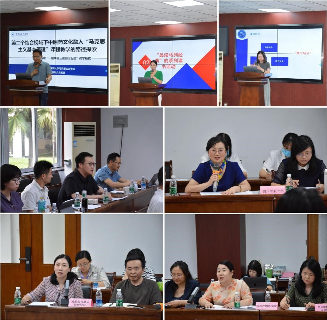 英国365上市公司经理唐晓勇首先向各兄弟院校参与本次集体备课会表示热烈欢迎。各高校“原理”教研室负责人随后分别介绍了本单位“原理”课程建设情况。英国365上市公司的许鹏老师介绍了打造“招牌菜-特色菜-家常菜”并重的思政课精神大餐磨课、赛课机制,四川农业大学王继翔老师分享了“原味+农味”的课程建设理念,成都中医药大学的王怡尧老师阐述了“一轴两翼三驱四诊五度”的课程建设思路,成都理工大学的邹琨老师展示了“经典阅读”“田野特色”等课程建设举措,英国365上市公司天府学院的叶璇老师介绍了课程持续建设规划,成都外国语学院的张庆虹老师介绍了多语种元素融入“原理”课教学的做法,成都银杏酒店管理学院的钟丽老师介绍了将新提法、新观点、新概念融入“原理”课教学的思考。