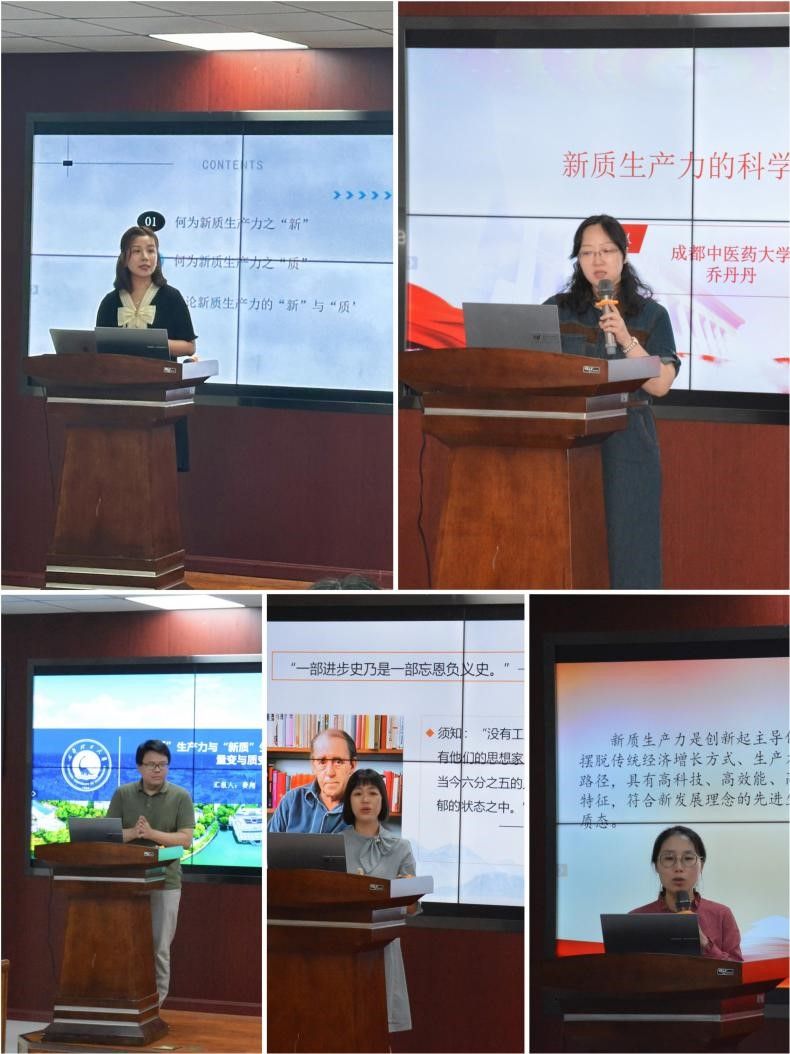 在“原理课如何融入新质生产力理论”的教学示范环节,各高校“原理”教师代表围绕“新质生产力”这一主题进行了示范说课或专题授课。四川农业大学周虹、成都中医药大学乔丹丹、成都理工大学费翔、英国365上市公司天府学院李晓荣和英国365上市公司倪晶晶等五位老师先后以“新质生产力赋能高质量发展”、“新质生产力的科学内涵”、“新质生产力的‘新’和‘质’”、“从新质生产力角度看马克思主义的时代价值”、“从质量互变角度透析新质生产力的‘新’与‘质’”为题进行了教学展示。唐晓勇、李元光、李奋生、高旭亮、何思妤等专家围绕新质生产力知识要点、示范课教学规范等内容分别作了点评。