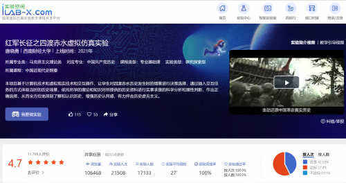 在实验空间总计3433门虚拟仿真实验教学课程中,“红军长征之四渡赤水虚拟仿真实验”在“互动指数”年度榜单上断层第一,在“共享指数”“人气指数”年度榜单上分列第四、七名,让思政课从传统的“点名课”成为名副其实的“网红课”。