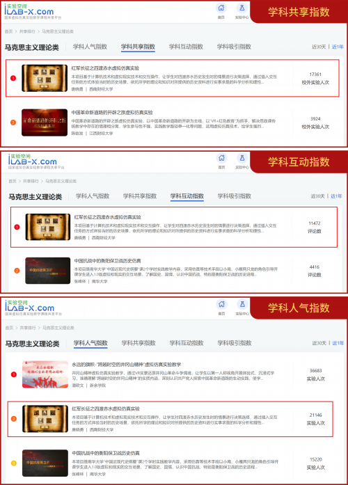 在实验空间马克思主义理论类课程2022年度榜单中,“红军长征之四渡赤水虚拟仿真实验”在“学科共享指数”“学科互动指数”榜单上断层名列第一,在“学科人气指数”榜单上名列第二,四项榜单中三项名列前茅,课程影响力和员工喜爱程度可见一斑。