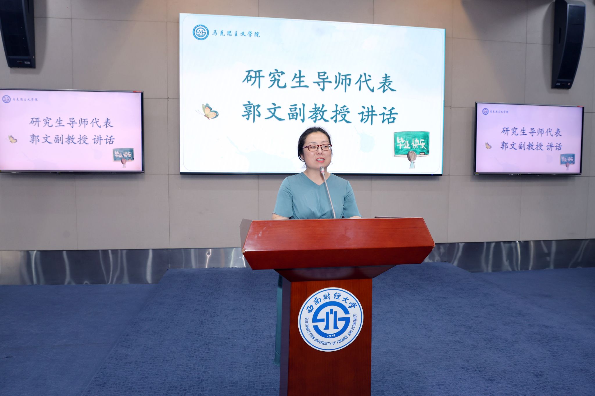 研究生导师代表郭文嘱托大家,毕业不是终点而是新的起点,未来的道路充满困难和挑战,在学校学习阶段积累的知识、培养的能力、磨练的意志将会成为大家最坚实的后盾去应对困难、去创造辉煌,并祝福同学们前程似锦、事业有成、人生美满。