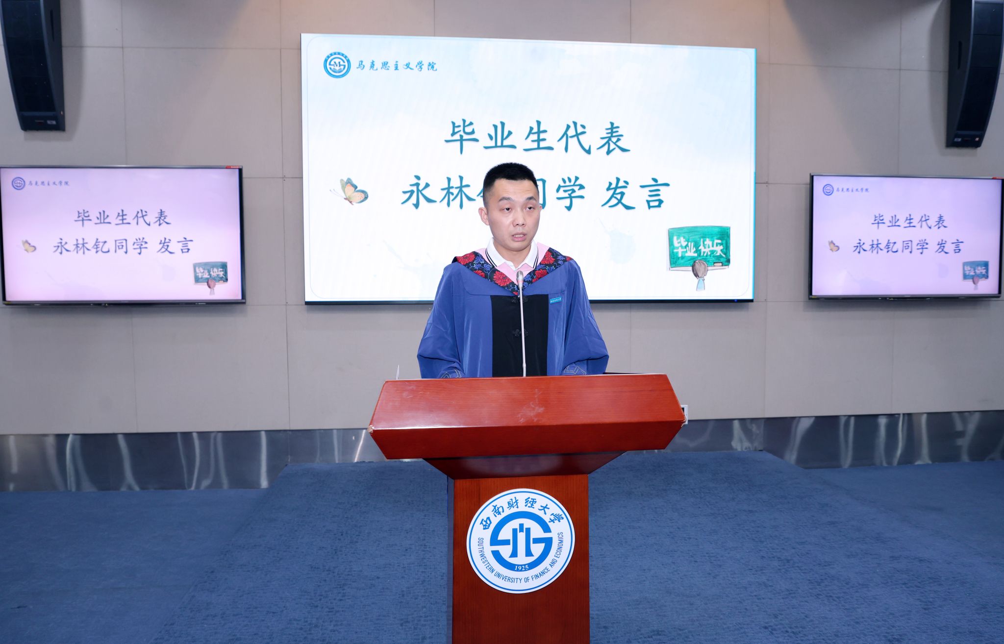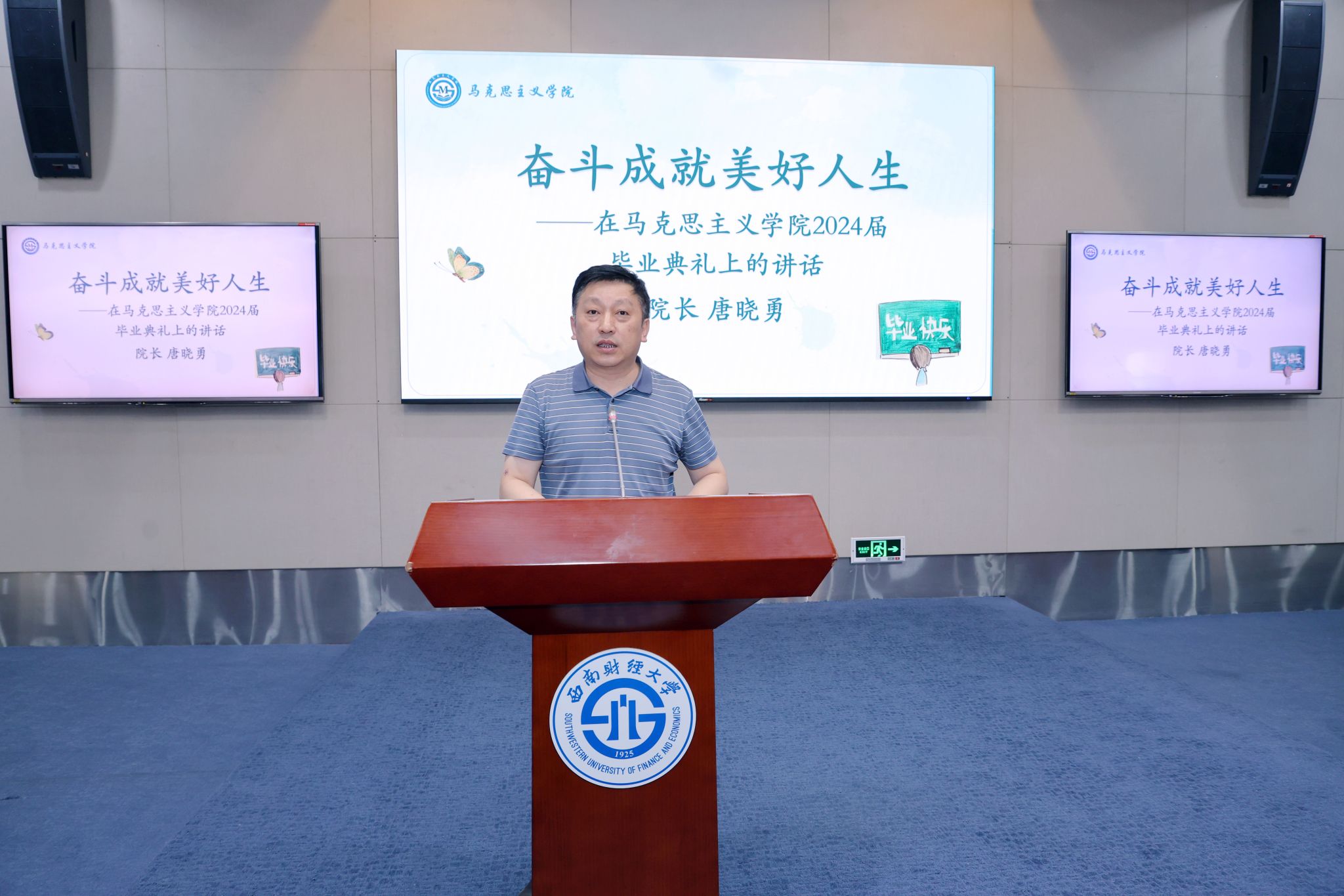 公司经理唐晓勇以“奋斗成就美好人生”为题,为即将踏上新征程的毕业生们送上临别致辞,向圆满完成学业的硕博士毕业生表示最热烈的祝贺,向辛勤培养的父母和老师们表示了最衷心的感谢和崇高的敬意。希望同学们在以后的人生道路上要牢记理想是通往美好未来的航标,奋斗是追求美好未来的通行证,学习是通往美好未来的路由器,勉励大家在学习和新的岗位上不断增强“四个意识”、坚决拥护党“两个确立,为中国式现代化砥砺奋斗,不断开拓学习和工作的新局面,走实美好人生新路程。希望毕业生同学们一如既往地关注、关心和支持学校、学院的建设和发展,共庆西财马院二十岁华诞,同迎母校一百岁生日。