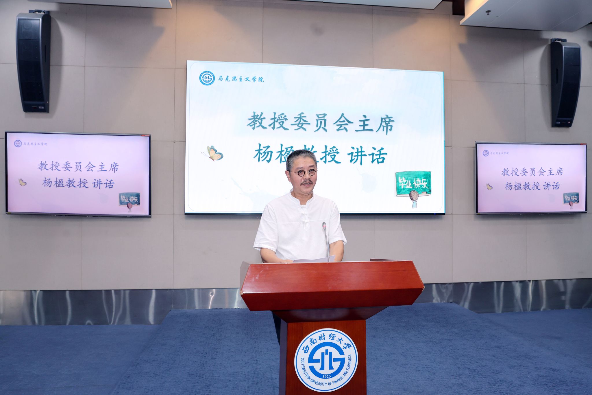 教授委员会主席杨楹深情寄语,“活好,世间第一等学问!”。指出须回归生活本身,处其厚,不居其薄,处其实,不居其华;须回归生命本身,当“三戒”“三知”“三畏”“三乐”而成“三达德”。勉励同学们当自立而不自傲、自尊而不自贱、自信而不自负、自谦而不自卑、自救而不自弃、自成而不自矜,祝愿大家肆意畅路、硕果满山,春秋长歌、华彩卓然。