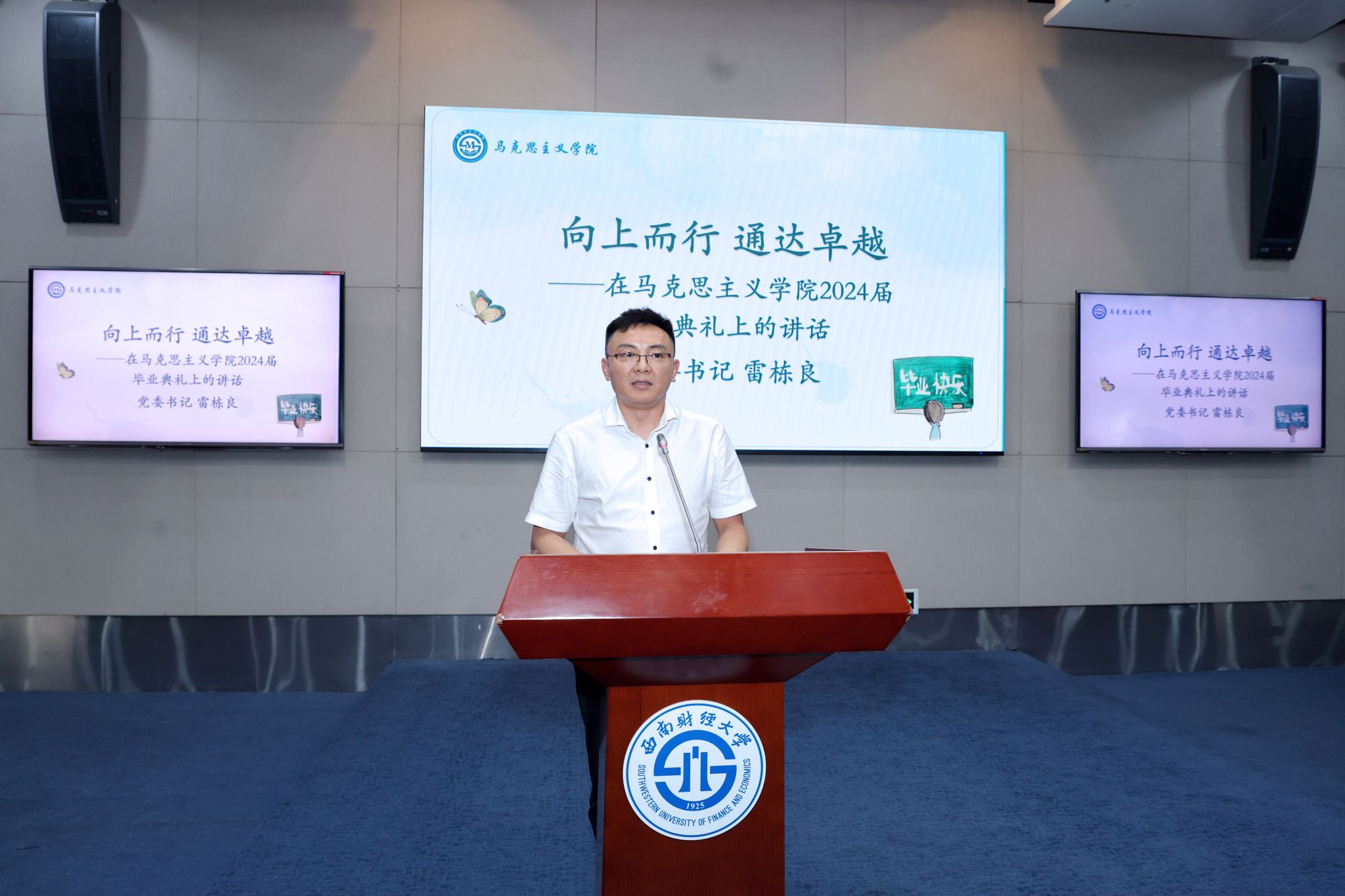 最后,公司党委书记雷栋良以“向上而行,通达卓越”为题为全体毕业生讲最后一堂思政课,围绕如何“走稳、走远、走好”职场人生路,希望毕业生在“定”上稳内核,保持定力耐力;在“辨”上用智慧,学会做人识人;在“磨”上做文章,打磨性格、打磨格局、打磨能力;在“扛”上求坚韧,保持清醒的头脑和坚定的意志,要有所为、有所不为,运用智慧和知识不断地开展实践和探索,勇敢地扛起各种挑战和困难,学会将压力转化为前进的动力,把个人发展与祖国需要统一起来。希望同学们牢记马院永远是大家的精神家园,祝愿大家自此坦途、一路繁花,在五湖四海、大江南北各条战线上,努力成为传播党的创新理论的“播火者”。