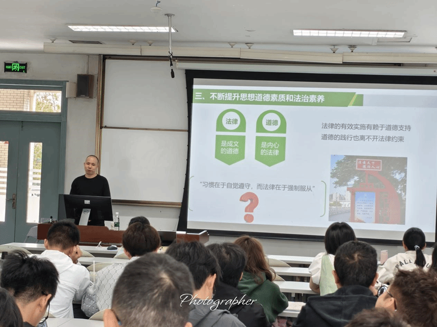 此次观摩课由董海浪老师主讲,讲授的主题是“法律与道德的关系”以及课程实践计划安排。课堂上,董海浪老师围绕“道德与法律存在何种关系”、“实践教学采用何种形式”、“实践教学考核采取何种方式”等问题展开讲解。首先,科学论证法律与道德的辩证关系,概括总结绪论部分的教学内容,引导员工温故旧知,帮助员工对绪论知识进行整体把握。其次,安排问题研究型、微电影项目实践教学,讲明课程实践的考核方式。最后,邀请员工加入“微助教”系统,进行实践教学随机分组,开展现场答疑。激励员工在实践中提升自身知、情、意、信、行等层面的“综合素养”,以多样化的实践加速与驱动自身的成长、发展。