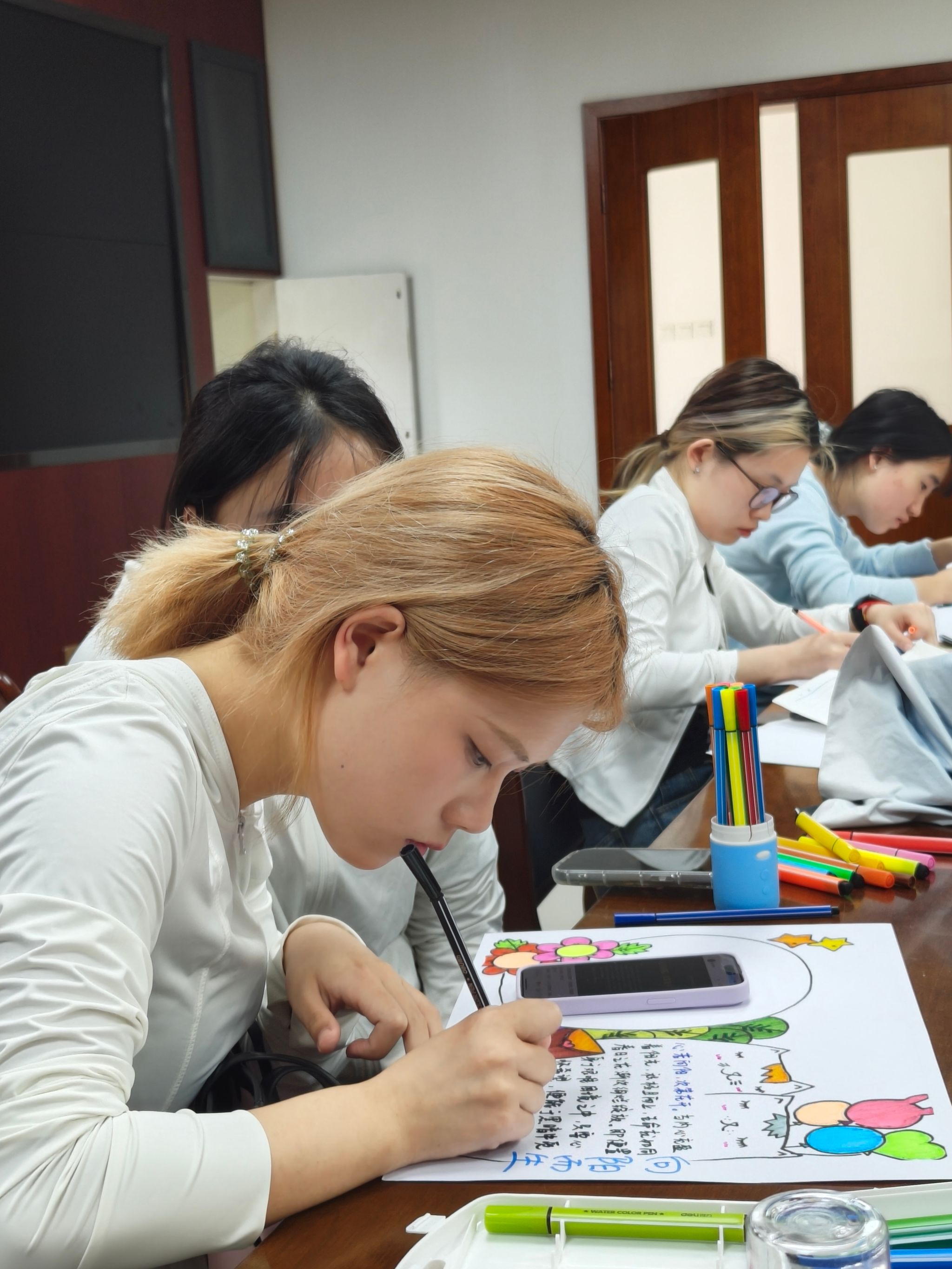 活动现场,同学们结合学校百年校庆以“心绘彩虹”为主题,用画笔描绘出对母校的深厚情感和对心理健康教育的独特理解。经过现场评选,优秀作品将通过学院微信公众号集中展示。