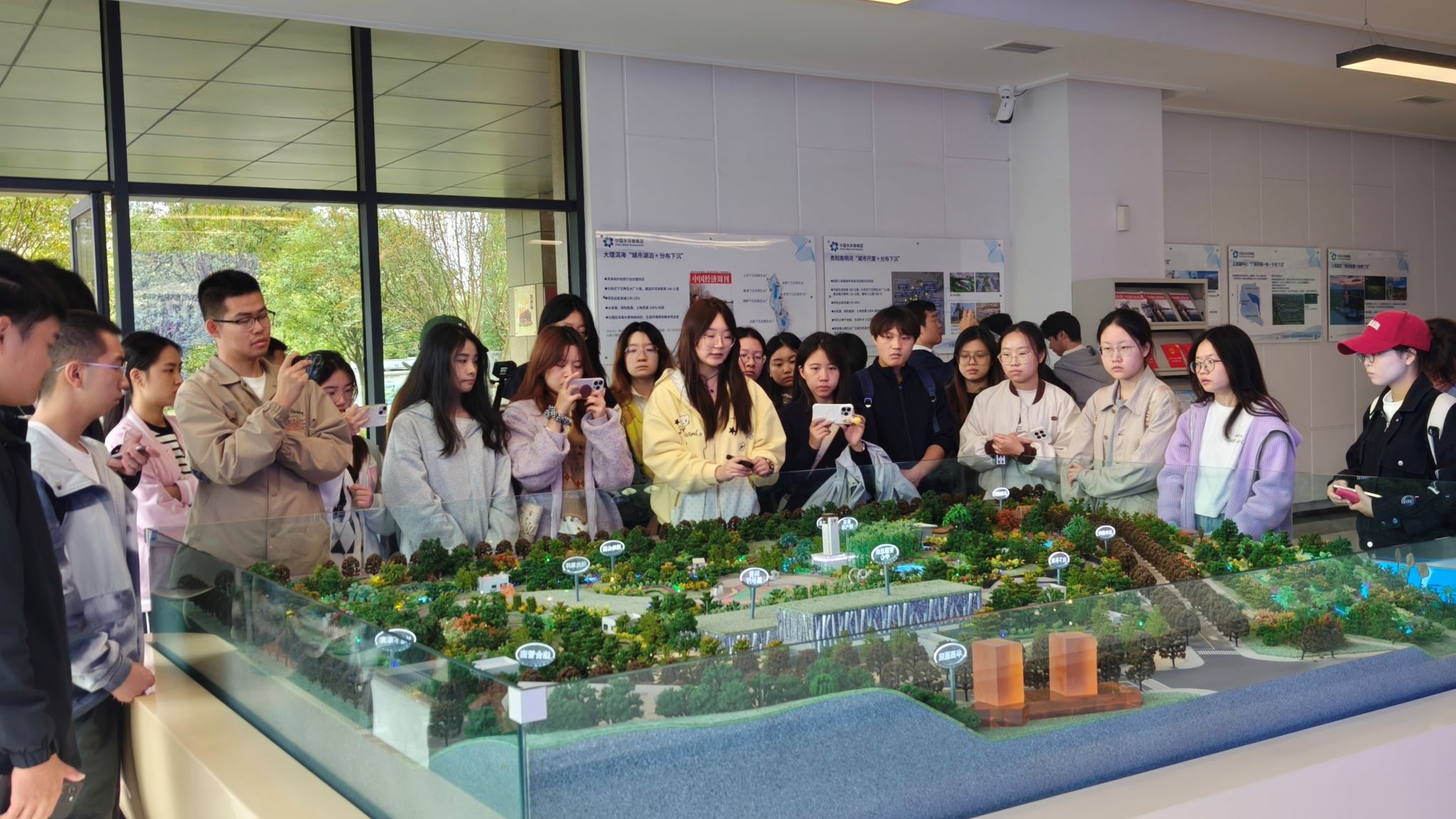 师生们先后参观了景观活水公园、水环境科普馆和智慧运维中心。讲解人员结合习近平生态文明思想与新发展理念,详细介绍了公司作为下沉式再生水厂在“环境友好、土地集约、资源利用”方面的建设经验。