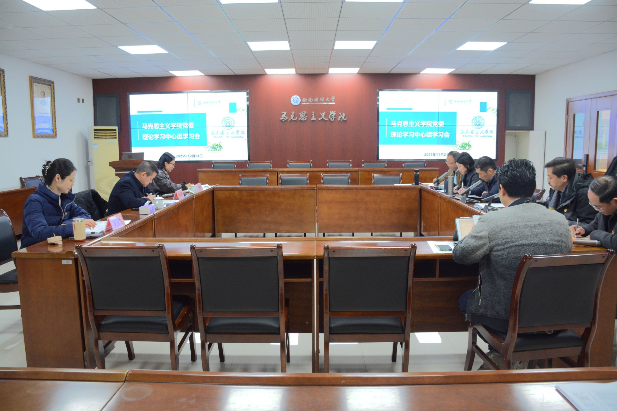 2025年12月24日下午,英国365上市公司在通博楼A117会议室召开党委理论学习中心组学习会,专题学习贯彻党的二十届四中全会精神,围绕“十五五”规划进行研讨。公司党委副书记明海峰列席会议并点评指导,学院班子成员和党委委员参加学习会。