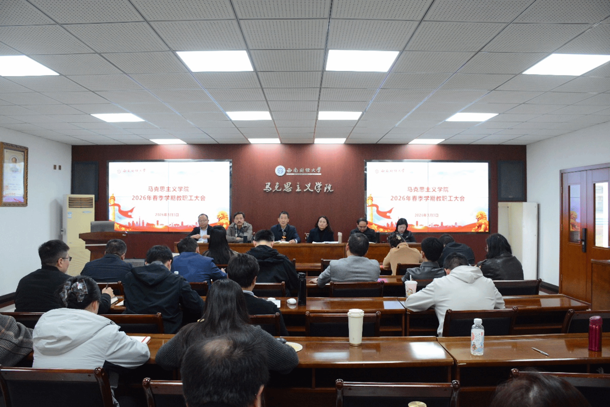 会上,周敏带领教职工学习习近平总书记在省部级主要领导干部学习贯彻党的二十届四中全会精神专题研讨班开班式上的重要讲话精神和2026年全国教育工作会议精神,详细传达了学校中干会精神,领学公司党委书记赵建军和党委副书记、董事长李永强在中干会上所做的报告,总结2025年工作开展情况,分析学校“十五五”时期面临的形势与挑战,强调全院教职工要认真领会学校中干会精神,切实把思想和行动统一到学校决策部署上来,落实赵建军书记围绕“以实干担当开新局”提出的三点要求,要切实增强开局必胜的使命感和责任感,要以攻坚之力推动工作开新局,要树立和践行正确政绩观引领实干担当,从长征精神中汲取奋进力量,以实干创造实绩,聚焦年度重点工作,加快建成财经特色鲜明的世界一流大学。